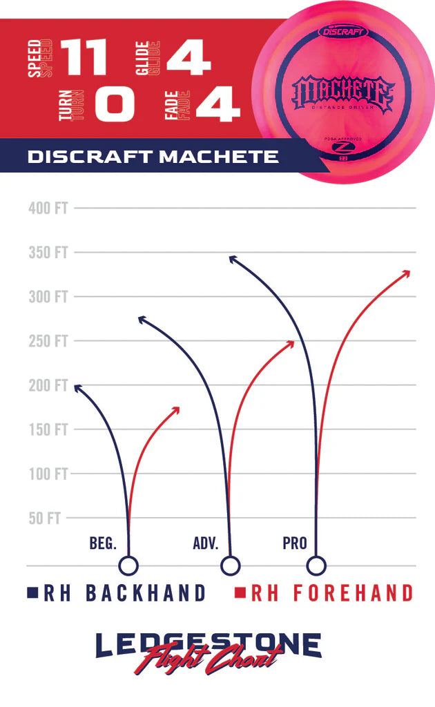 The Machete is a headwind-fighting, overstable distance driver. Turning this disc over is nearly impossible. It has extreme overstability but still manages to push forward for increased distance with its strong glide. The Machete is perfect for spike hyzers, long flex shots, and getting around corners.